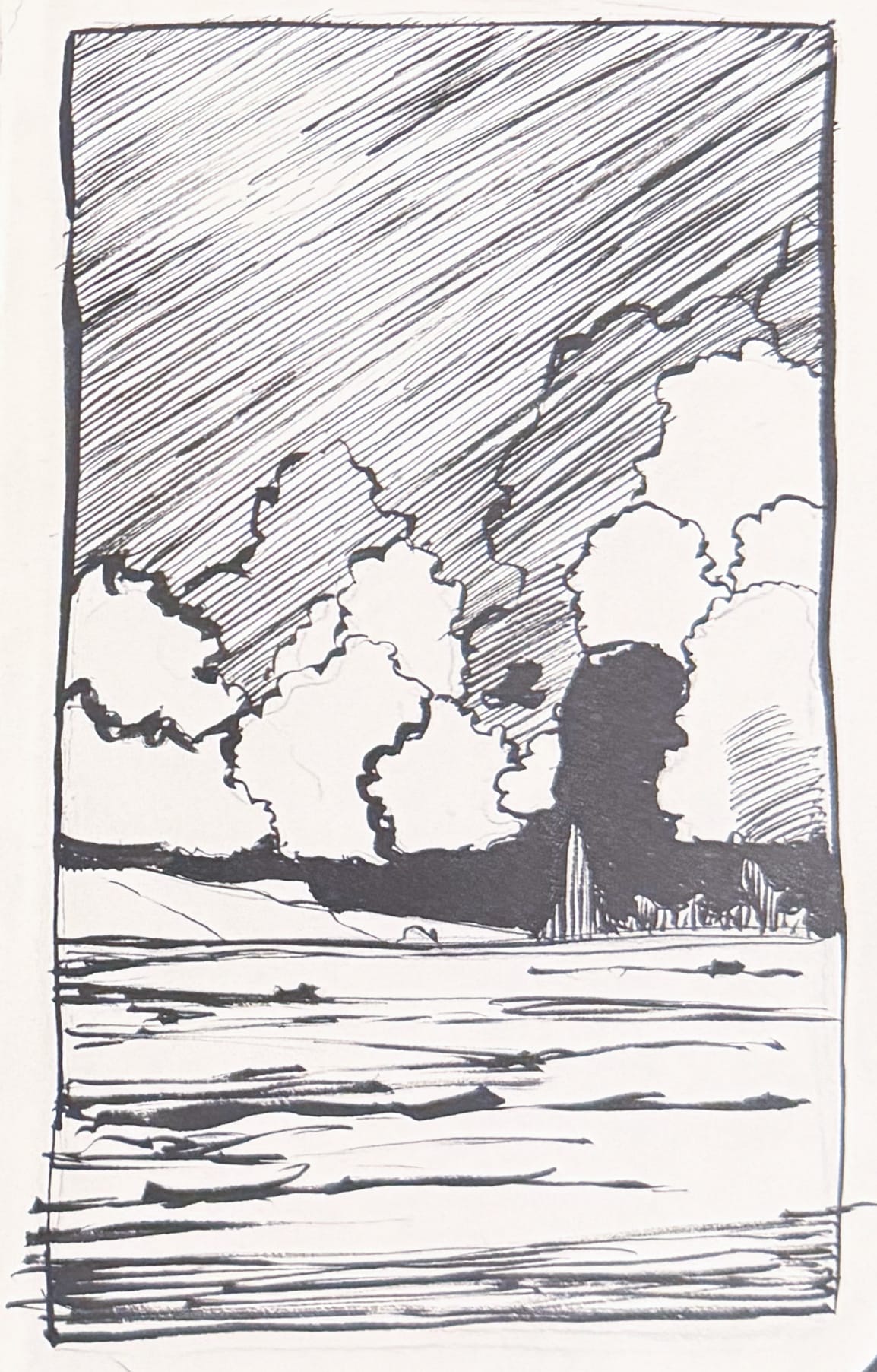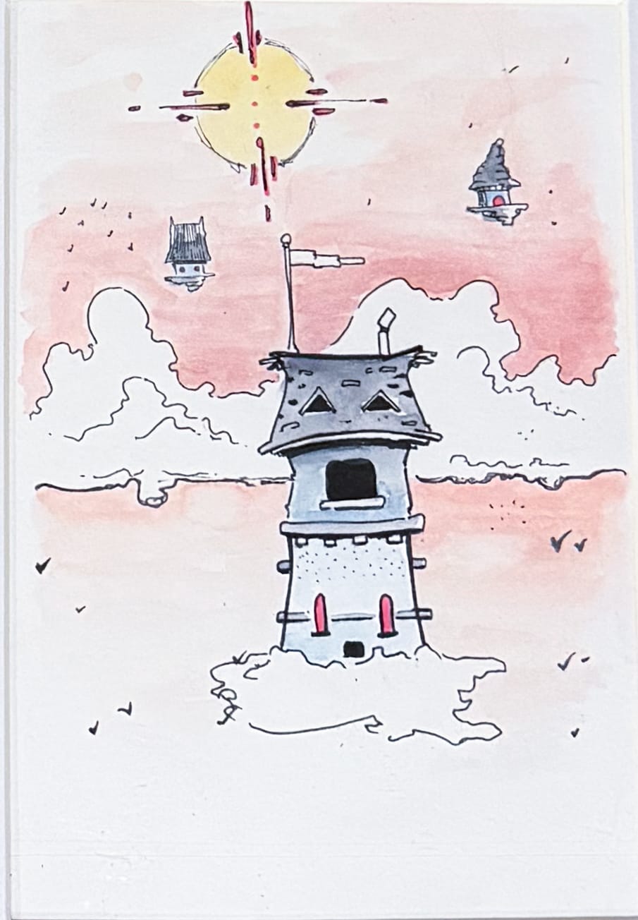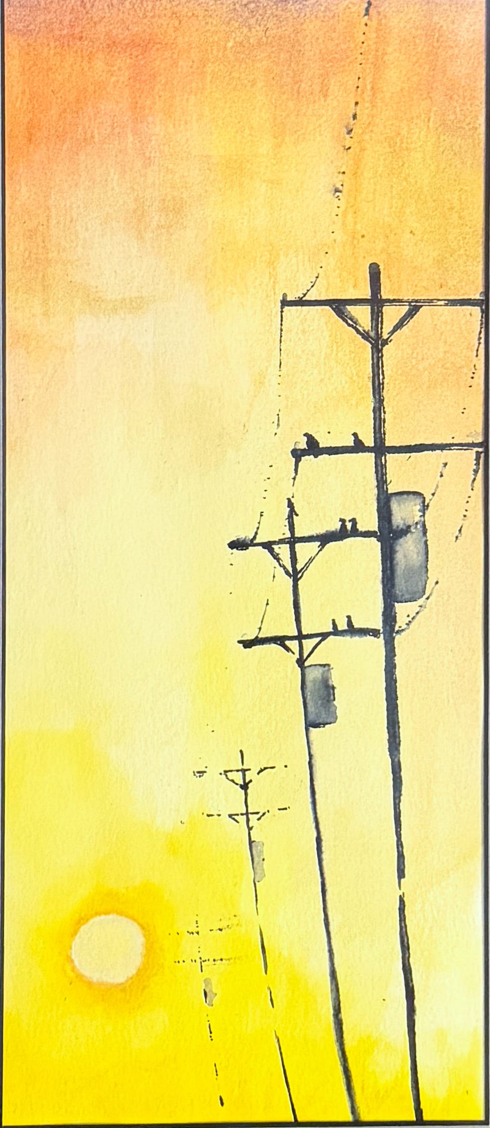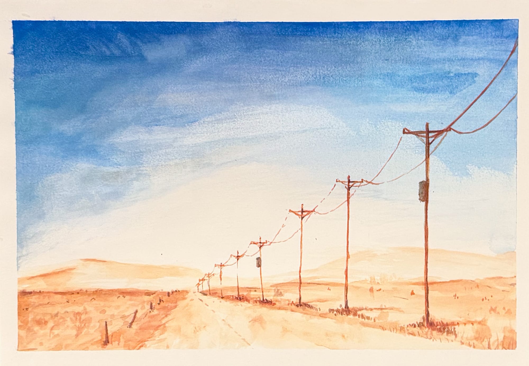 Entrapped A haunting exploration of vulnerability and machinery. Figures navigate between organic tendrils and mechanical forms in this evocative charcoal work that questions the boundaries between human and machine.Her Glow Ethereal watercolor portrait capturing serene introspection. Soft washes of blue surround a figure lost in quiet thought.Monsters 3 Floating towers drift through a rose-tinted sky in this whimsical ink and watercolor piece. A surreal dreamscape where architecture defies gravity beneath a watchful sun.Ocean's Last Light Vibrant acrylic captures the fleeting brilliance of sunset over water. Fiery oranges and deep blues collide in bold, textured brushwork.Pink Crown A contemplative portrait in watercolor and ink. Soft yellows frame a young figure adorned with a delicate crown, eyes closed in quiet reflection.Summer's Heat Power lines silhouetted against a scorching sunset sky. Warm yellows and oranges evoke the languid intensity of a hot summer evening.The Back Road Wooden poles march toward the horizon along a dusty rural road. Watercolor washes convey the vast openness of countryside under endless blue sky.The Last Light Deep indigo sky meets blazing horizon in this abstract seascape. The day's final moments rendered in rich, emotive color.The Train to Town A pastoral moment rendered in soft acrylics. Distant trees emerge from morning mist beneath an expansive, atmospheric sky.The Valley Bold ink hatching creates dramatic contrast in this landscape study. Billowing clouds rise above a distant treeline, capturing the quiet tension before a storm.
