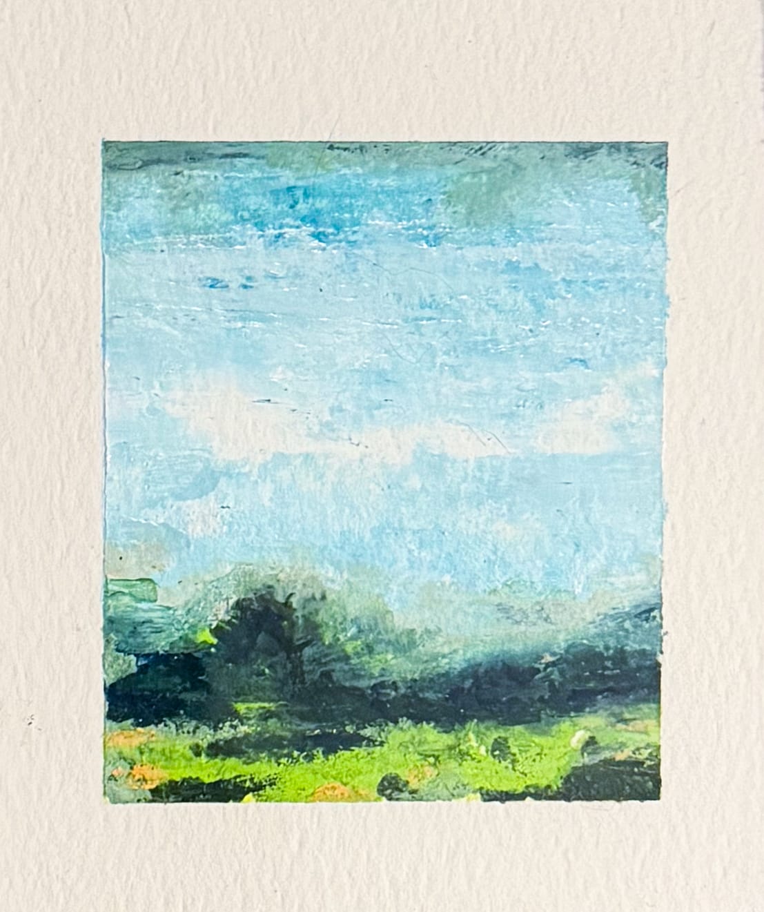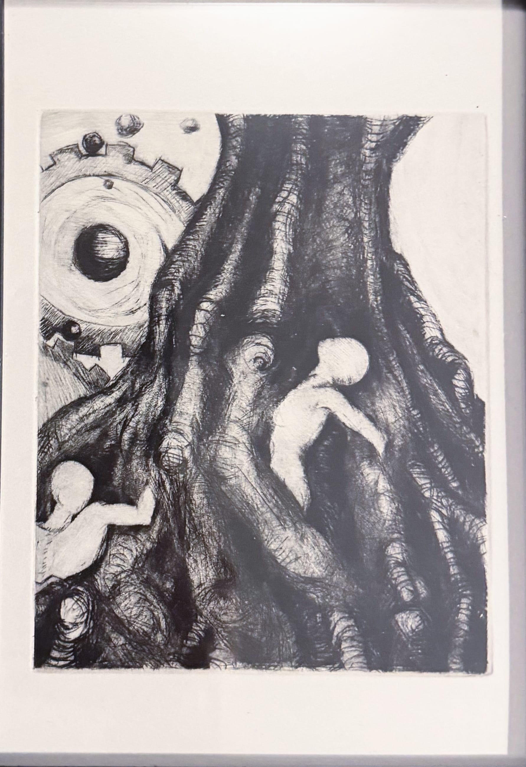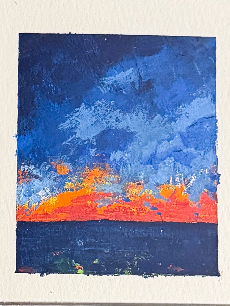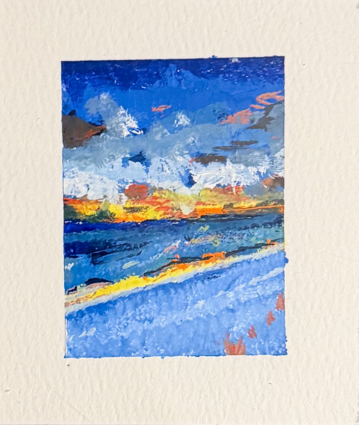 Entrapped A haunting exploration of vulnerability and machinery. Figures navigate between organic tendrils and mechanical forms in this evocative charcoal work that questions the boundaries between human and machine.Her Glow Ethereal watercolor portrait capturing serene introspection. Soft washes of blue surround a figure lost in quiet thought.Monsters 3 Floating towers drift through a rose-tinted sky in this whimsical ink and watercolor piece. A surreal dreamscape where architecture defies gravity beneath a watchful sun.Ocean's Last Light Vibrant acrylic captures the fleeting brilliance of sunset over water. Fiery oranges and deep blues collide in bold, textured brushwork.Pink Crown A contemplative portrait in watercolor and ink. Soft yellows frame a young figure adorned with a delicate crown, eyes closed in quiet reflection.Summer's Heat Power lines silhouetted against a scorching sunset sky. Warm yellows and oranges evoke the languid intensity of a hot summer evening.The Back Road Wooden poles march toward the horizon along a dusty rural road. Watercolor washes convey the vast openness of countryside under endless blue sky.The Last Light Deep indigo sky meets blazing horizon in this abstract seascape. The day's final moments rendered in rich, emotive color.The Train to Town A pastoral moment rendered in soft acrylics. Distant trees emerge from morning mist beneath an expansive, atmospheric sky.The Valley Bold ink hatching creates dramatic contrast in this landscape study. Billowing clouds rise above a distant treeline, capturing the quiet tension before a storm.